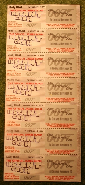 007 Daily Mail scratch card Die Another Day. Die Another Dayjohn Scratch card issued in the Daily Mail in November of 2002 relating to Die Another Day. [Show as slideshow]