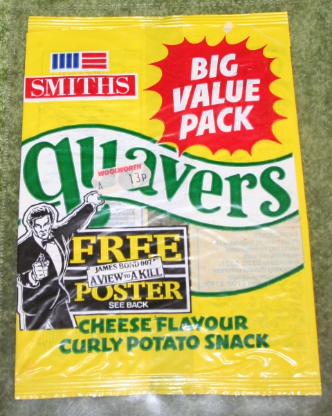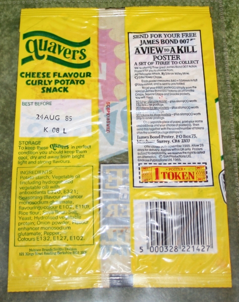 Quavers packet A View To A Killjohn Empty packet of Quavers with a James Bond A View to a Kill offer on packet.