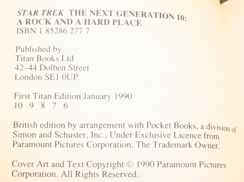 STTNG UK Paperback No 10 Star Trek TNGjohn A Rock and hard place by Peter David published by Titan books in 1990. Original Price £4.99 [Show as slideshow]